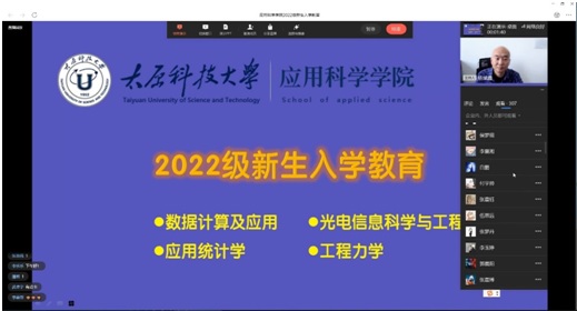 为了使2022级新生能够更好地适应大学生活,及时完成角色转变,增强自我教育、自我管理和自我服务的能力,2022年9月4日下午3时,我院通过企业微信平台以线上直播的形式,组织开展了2022级新生入学教育活动。学院党委书记彭英、院长林金保、副院长李晋红、杨斌鑫、团委书记王志社、辅导员李刚和全体2022级新生参加了本次活动。本次活动由学院副院长杨斌鑫主持。